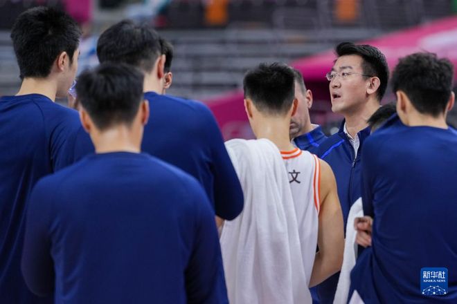 ▲四川队主教练王博(右二)在赛前布置战术 新华社发