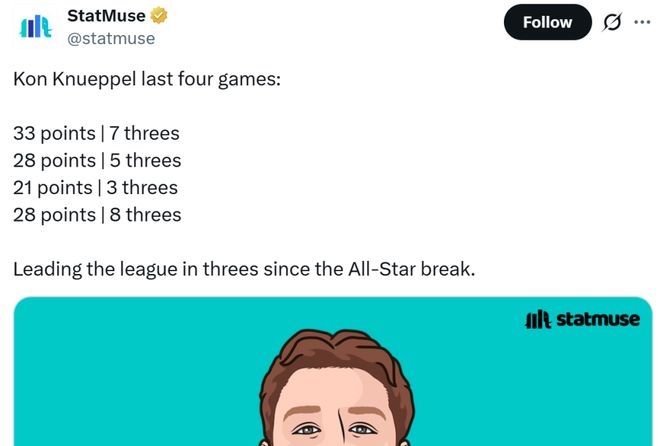 更让人眼前一亮的是,克努佩尔几乎没有遭遇新秀墙,反而开季至今状态一路呈现出上扬势头,全明星后的5场比赛克努佩尔合计命中多达26记三分高居同期联盟第一。