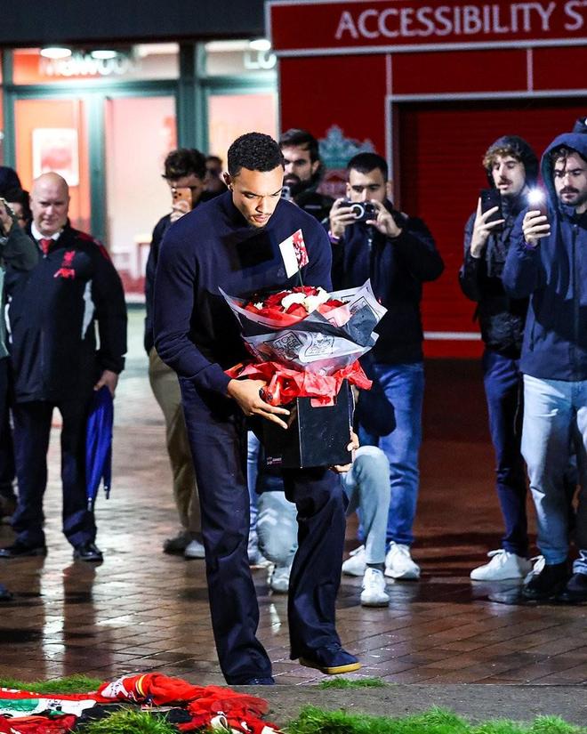 利物浦主场对阵皇马欧冠比赛前夕,阿诺德和皇马主帅阿隆索、队友赫伊森等人前往安菲尔德球场外若塔的纪念碑前献花。