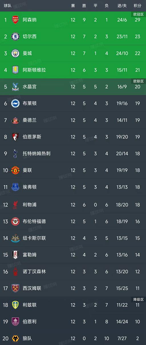 目前紧追枪手的是切尔西,后者2-0战胜了伯恩利,目前的积分是23分。曼城本轮1-2不敌纽卡斯尔联,遭遇赛季第4场败仗,已经落后了枪手7分,陷入了被动。阿斯顿维拉以21分暂列第4名,他们只领先身后的水晶宫1分,欧冠门票并不保险。布莱顿、桑德兰和伯恩茅斯的积分都是19分暂列第6-第8名。排在倒数后三名的球队分别是利兹联、伯恩利和狼队!