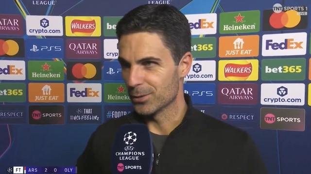 欧冠联赛阶段第二轮,阿森纳主场2-0击败奥林匹亚科斯,赛后,枪手主帅阿尔特塔接受了TNT体育的采访,他称赞了厄德高和全队的表现,表示很高兴取得胜利并零封对手。