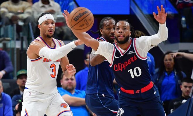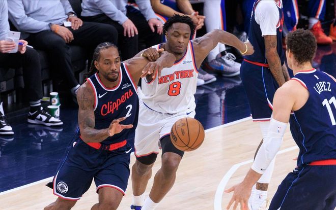 迈克-布朗无奈表示,已经对莱昂纳德的包夹做到极致了,然而洛佩兹、琼斯和马瑟琳等快船其他球员都投进了三分球。本场比赛,快船全队三分39投18中,远投命中率达到了46.2%,给到小卡足够的支持,随着加兰和马瑟琳的到来,卡子哥肩上的压力骤减,他终于得到了足够的帮助,让所有坚持包夹他的球队付出了代价。如果尝试不包夹莱昂纳德呢?尼克斯这场比赛也不是没有“以身试法”过,面对防守悍将OG-阿奴诺比的贴身盯防,卡子哥高位持球拜佛后的撤步跳投一气呵成,稳稳命中且动作行云流水,很快就打消了尼克斯单防他的念头。