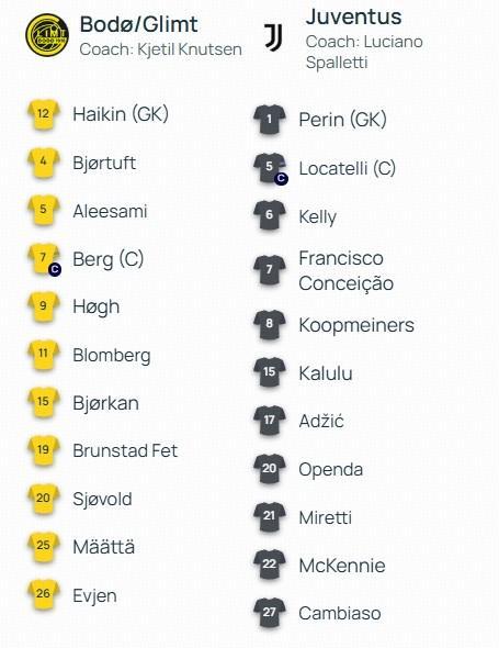 北京时间11月26日04:00,欧冠 联赛阶段 第5轮,博德闪耀主场迎战尤文图斯,赛前双方球队首发名单公布如下:
